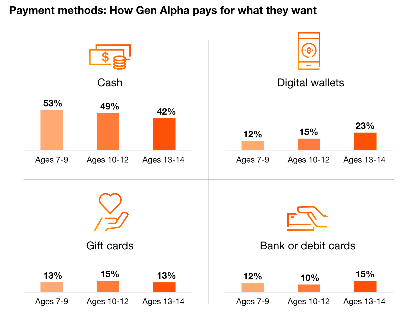 "Payment methods remain surprisingly traditional. Cash is still around, even for a generation that lives online. But we do see shifting behavior over time, likely as parents feel that kids gain maturity with age. For instance, kids’ use of digital payments or wallets rises, with 23% of 13- to 14-year-olds using them compared to 12% of 7- to 9-year-olds.